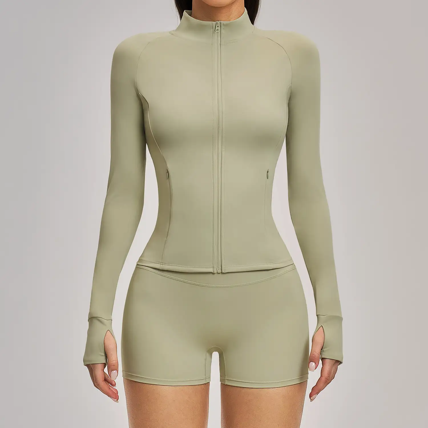This advanced long-sleeve yoga jacket is engineered for peak athletic performance in cooler climates. The design prioritizes ergonomic comfort with a high-stretch, slim-fit silhouette that contours to the body. Integrated technical features such as moisture-wicking thumbholes and secure internal storage make it a versatile essential for professional activewear collections.